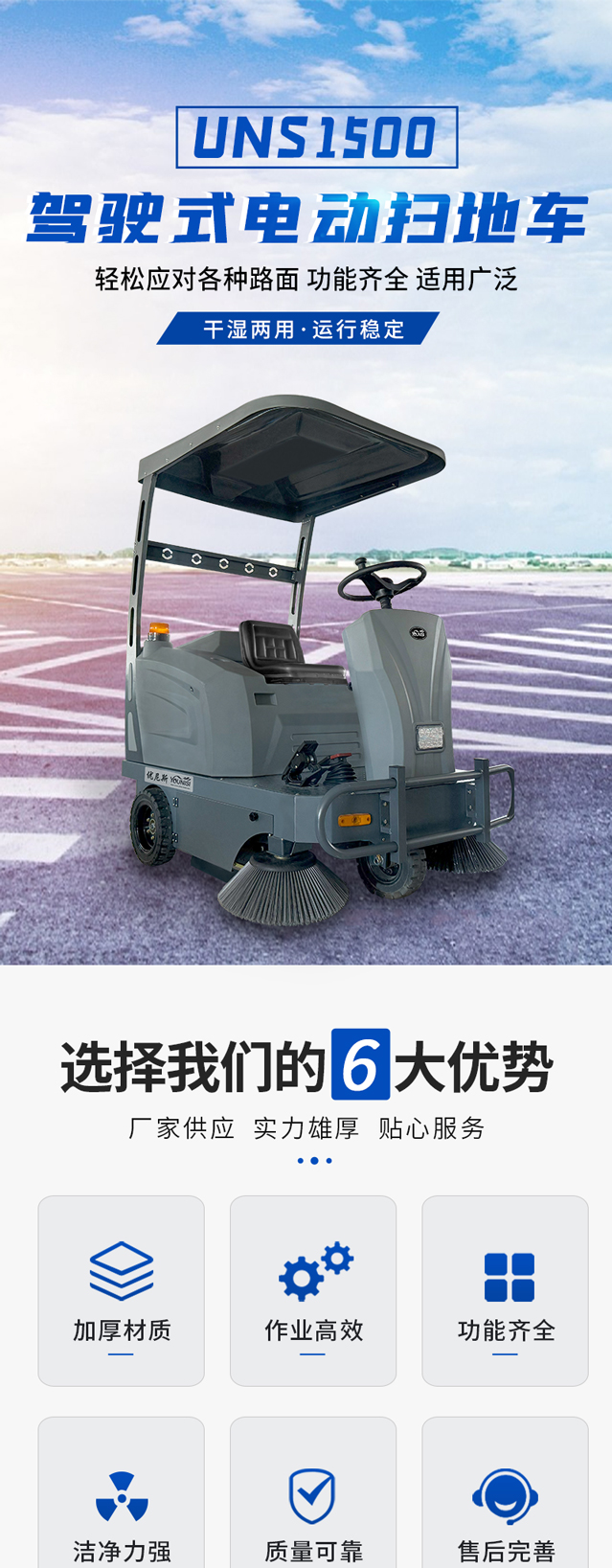UNS1500型采用吸尘扫地的自动清洁体系,此款扫地机主要用于高校、物业小区、工厂车间、广场、公园等部门的室内外清扫。