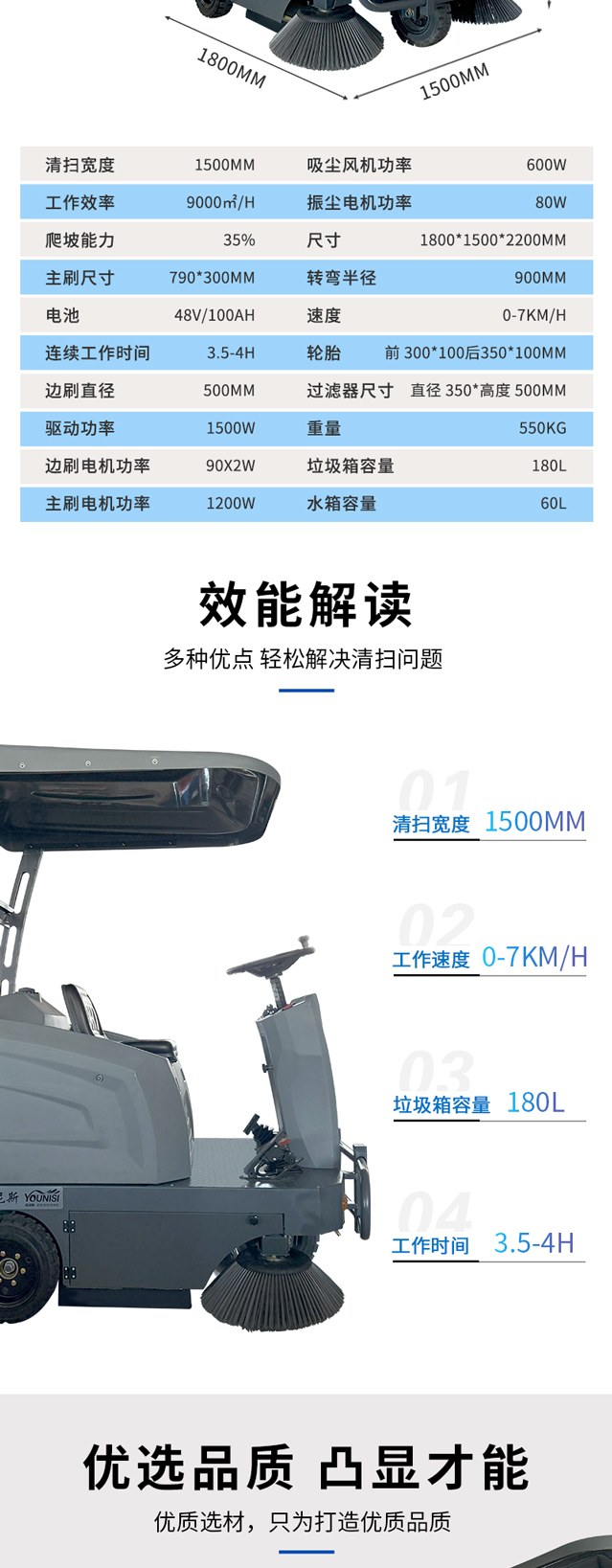 * 清扫宽度1500MM,可原地转弯